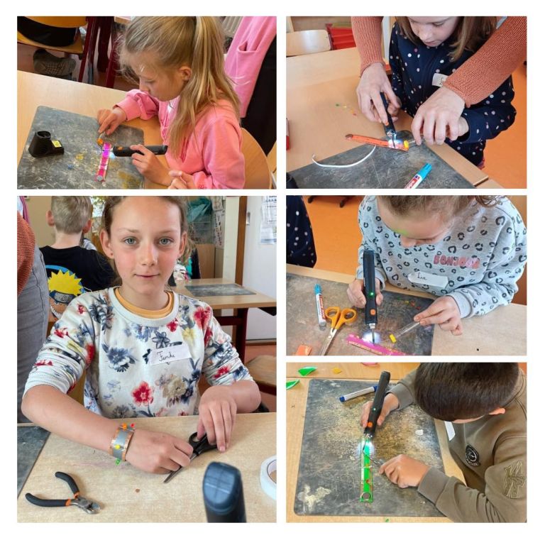Groep 5/6 heeft van de leerkrachten van de praktijkklas een armband gemaakt. Ze leerden een stroomkring maken en dit zo te solderen dat de lampjes het ook deden.