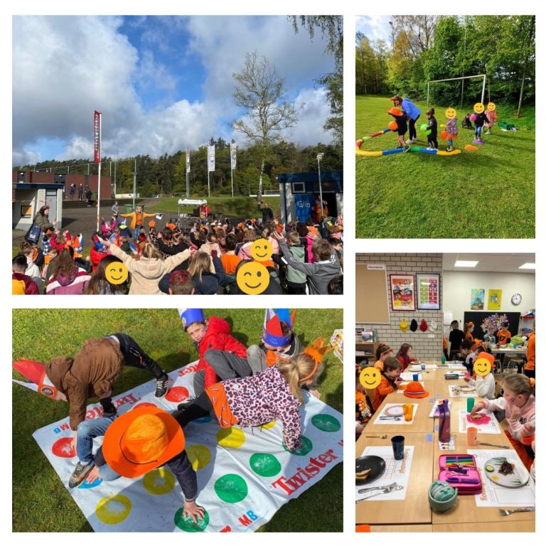 Na een gezellig koningsontbijt liepen alle groepen naar het sportveld. Hier waren door leerkrachten en hulpouders allerlei sportieve activiteiten klaargezet.